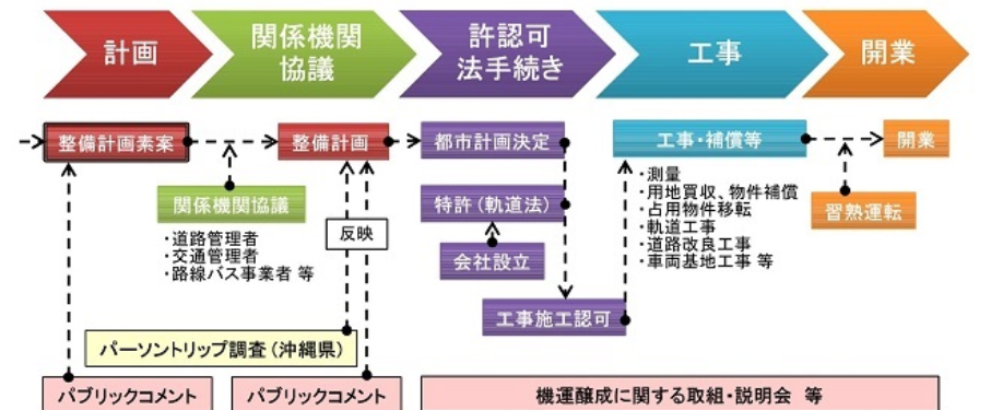 - Q:モノレールを延長するのではダメなのですか? A:モノレールは高架という構造上、LRTのようなきめ細かな駅(電停)設置が困難で、建設費も非常に高額です。LRTは「モノレールの駅と各地域を結ぶ」役割であり、ゆいレールとの連携で効果を発揮します。